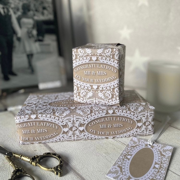 Mr & Mrs Gift Wrapping Paper and matching gift tag.